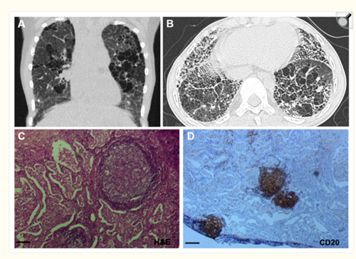 In SAVI patients, gain-of-function mutations in the STING1 gene drive constitutive type I interferon signalling, resulting in chronic inflammation, vasculopathy and high morbidity. Approximate 1/3 or the patients have a severe lung phenotype. Respiratory symptoms in SAVI can be insidious and are not specific (chronic cough, exertional dyspnea, and hemoptysis) and pulmonary function tests shows mainly a restrictive syndrome with diffusion impairment, sometimes associated with hyperinflation, but also obstruction or a mixed lung function impairment and biopsies shows increased inflammation and fibrosis. Repeated infections are common and problems with chronic multi drug resistant bacteria and may lead to the need of a lung transplant.