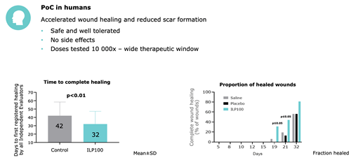 ILP100-Topical has undergone extensive drug profiling with successful regulatory interactions and approvals for phase 1 and 2/3 trials in EU (EMA/CAT, Swedish MPA) and US (FDA/CEBR), a first in human double blinded RCT trial showing favourable safety profile and significantely 10 days faster skin healing. An IND is open in the US and a clinical trial in pediatric patients with the genetic disease SAVI have ben planned together with experts at interferonophaties at the NIH, FDA have granted an Rare Paediatric Disease Designation (RPDD) for SAVI. Regulatory compliance with approval processes been vetted with Indian CDSCO and Chinese NMPA by potential partners for other undisclosed indications.