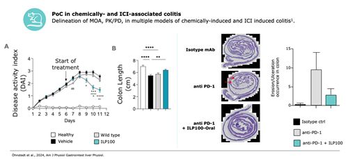 Up to 58% of cancer patients receiving immune check point inhibitors (ICIs) develop gastrointestinal toxicities and cause of death is most often ruptures leading to sepsis, sepsis with multi drug resistant bacteria is >2.5x more common in cancer patients. With ILP100-Oral Ilya Pharma is seeking the clinical PoC for a new first-line-treatment in patients with ICI-induced colitis in a multicenter first-in-human phase 1/2a, the trial enrolling healthy subjects and cancer patients on ICIs suffering from ICI-induced colitis stage 1 and 2. The main hypothesis, and driver of value, is to allow the immune system to be aggressive fighting the cancer, as induced by the ICIs - but leaving the gut alone using ILP-100-oral as a local acting anti-inflammatory treatment. The current standard of care for ICI-induced colitis relies solely on systemic anti-inflammatory treatments being steroids and biologics and these come with a number of drawbacks such as their adverse event profiles and counteracting the anti-cancer effects of the ICIs. The ultimate goal is to facilitate a larger portion of patients on ICI treatment to be able to complete the lifesaving treatment.